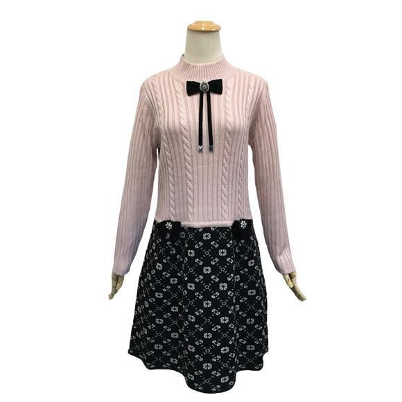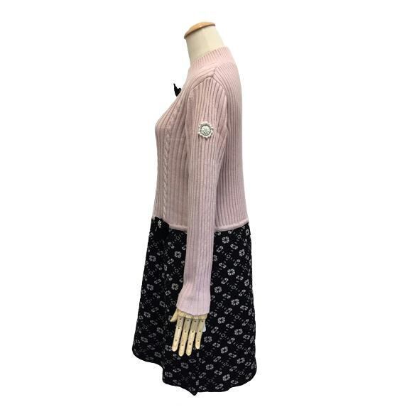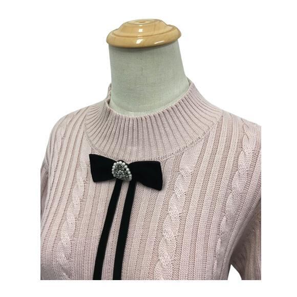 2022年秋冬50%OFF スーパービューティー ワンピース 胸元リボンブローチ ジャガード編み ハイネック ニットワンピー ピンク M L LL スーパービューティー42 大人可愛い 2221032