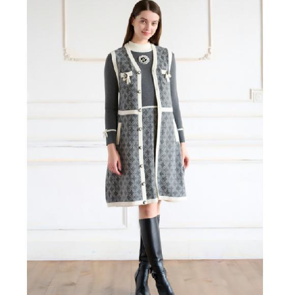 2022年秋冬50%OFF スーパービューティー ロングベスト ジャガード編みV開きデザイン配色ニット ジレ ピンク M L LL スーパービューティー44 大人かわいい服 2221030