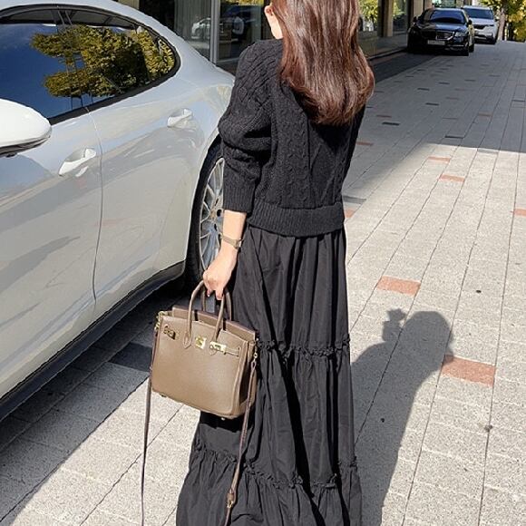 ニットドッキング ティアードワンピース ロング 秋冬 マキシ丈 ブラック フリー 体型カバー 美シルエット カジュアルスタイル 楽ちん