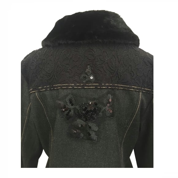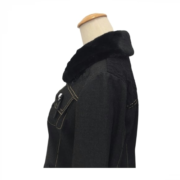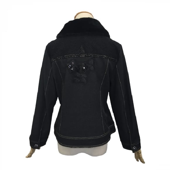 スーパービューティー デニムジャケット 胸元スパンコール 刺しゅう エコファー襟ストレッチデニムJK オーラボー Super Beauty M L LL 40 42 44 ブラック 2227001