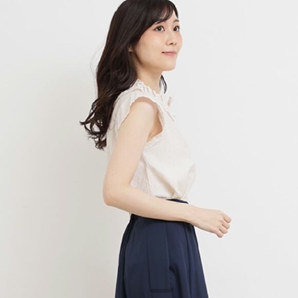 2023年春夏入荷 エクラタン カットソー ラッフルサマーブラウス ベージュ M L 30代 40代 50代 EC231068 働く女子 通勤コーデ 大人可愛いコーディネート
