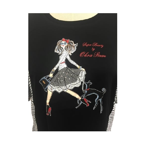 スーパービューティー ロングTシャツ 2023年春夏入荷 胸元プリントギンガムチェック切替 ブラック M L LL 30代 40代 50代 60代 2312017