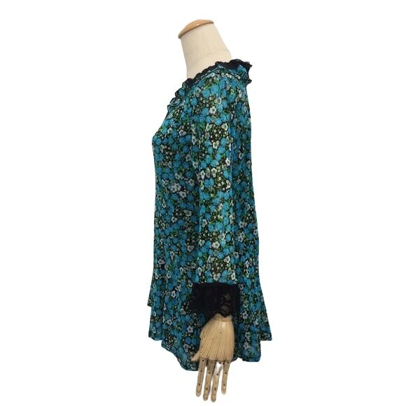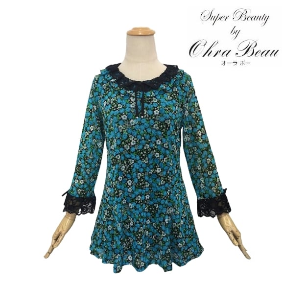 スーパービューティー 44 チュニック 2023年春夏入荷 小バラ柄 パワーネット 7分袖チュニックカットソー ブルー M L LL 30代 40代 50代 60代 2312006 大人かわいい服