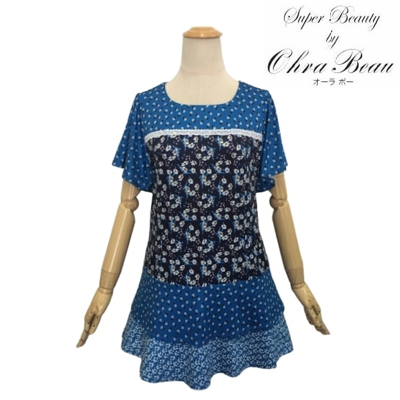 スーパービューティー チュニック 2023年春夏入荷 小花柄プリント切替スムース素材チュニックTシャツ ブルー M L LL 30代 40代 50代 60代 2312009