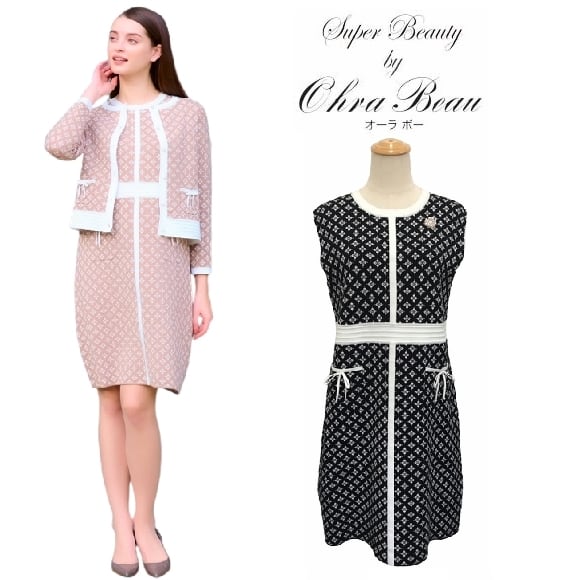 スーパービューティー ワンピース 2023年春夏 配色切替ジャガード編みニットワンピ 2311009 ブラック M L LL 30代 40代 50代 60代 大人かわいい服 ミセス