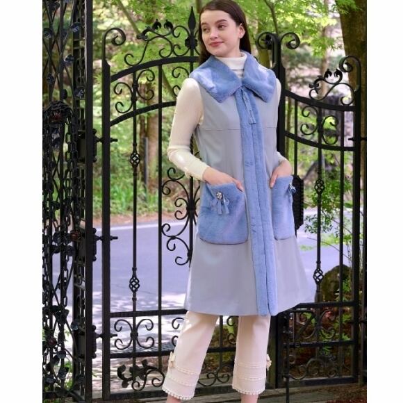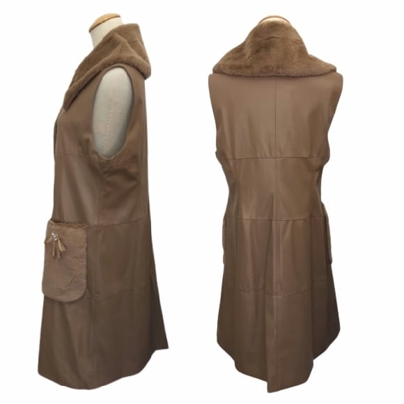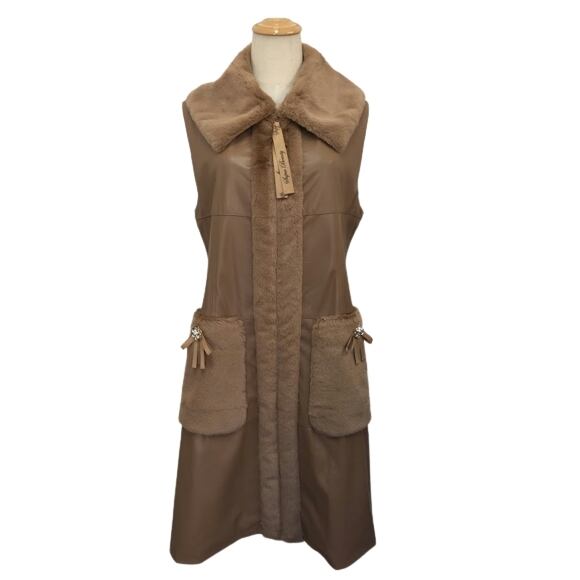 スーパービューティーベスト 襟 ポケット エコファー使い 合皮ロングベスト モカ 2023年秋冬 M L LL 2327007 大人可愛い
