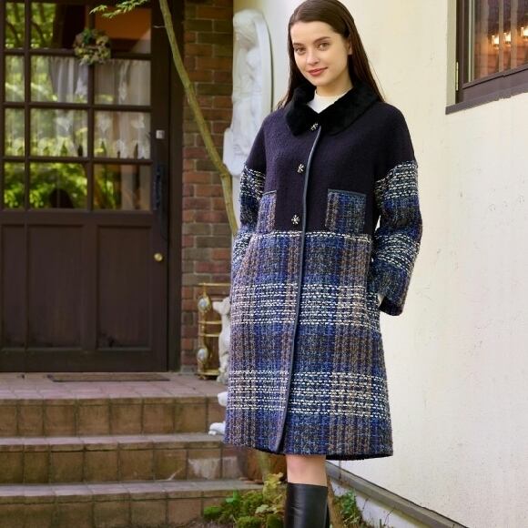 スーパービューティー コート ツイード切替エコファー襟 オフショルダー チェック柄コート 2328004 ネイビー 2023年秋冬 M L LL 大人可愛い
