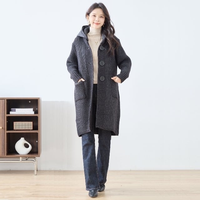 ニットコート 3つボタン ロングニットコート ブラック グレー ノーボタン R32-291 フリー M L TRUBE デイリーファッション 普段着 おしゃれ着