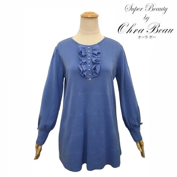 スーパービューティー ニットチュニック 胸元チュールフリルデザイン セーター 2321053 ブルー 2023年秋冬 LL 大人可愛い ミセス