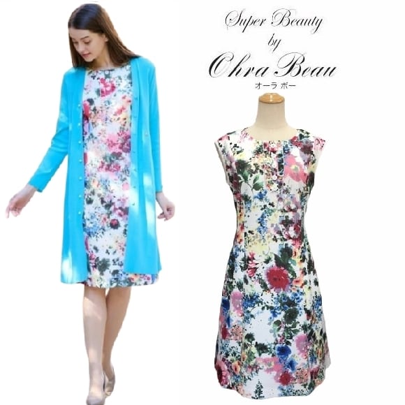 スーパービューティー ワンピース 胸元フリル ビジュー使い花柄 2416003 ホワイト 2024年春夏 M L LL 大人可愛い