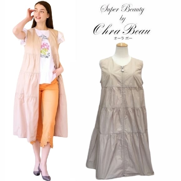 スーパービューティー ジレ タフタ素材ギャザー切替 ロングベスト 2417009 ベージュ 2024年春夏 M L LL 大人可愛い