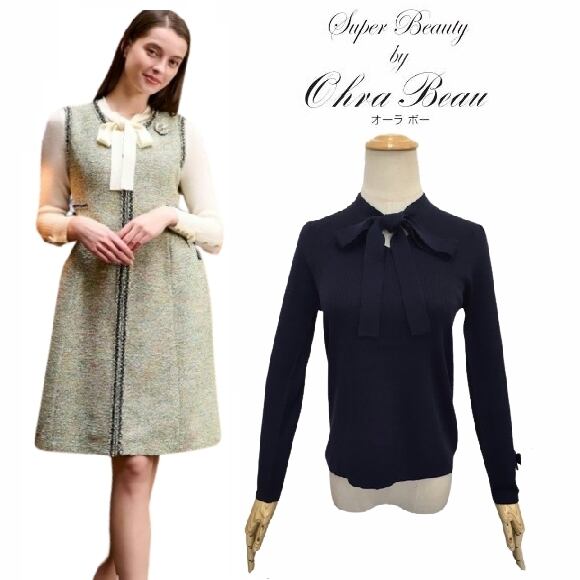 スーパービューティー ニット リボンタイ 袖リボン 金ボタン 2321024 ネイビー 2023年秋冬 大人かわいい服 大人スタイル レディース キレイメ アパレル 女性 M L LL Super Beauty 30代 40代 50代 60代
