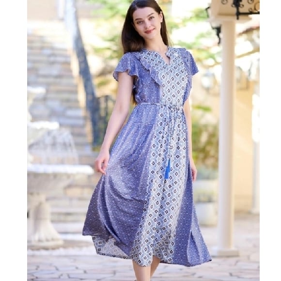 スーパービューティー ワンピース 幾何学模様 切替ロングワンピ 2416027 ブルー 2024年春夏 M L LL レディース 大人可愛い オーラボー ミセス キレイメ アパレル 女性