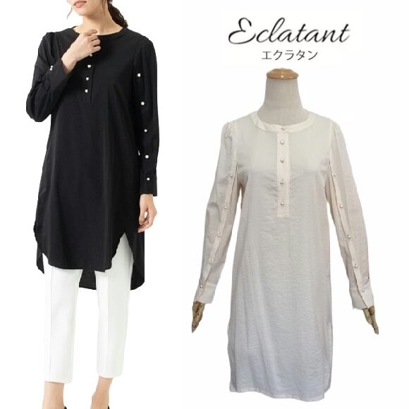エクラタン ブラウス ラメ パールビーズ スタンドカラー サイドスリット エクリュ EC233026 2023年秋冬 レディース 大人可愛い ミセス キレイメ アパレル 女性 30代 40代 50代