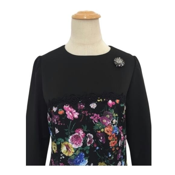 スーパービューティー ワンピース 胸元切替 花柄 ダンボールニット 2426007 ブラック 2024年秋冬 大人かわいい服 ミセス レディース キレイメ アパレル 女性 30代 40代 50代 60代