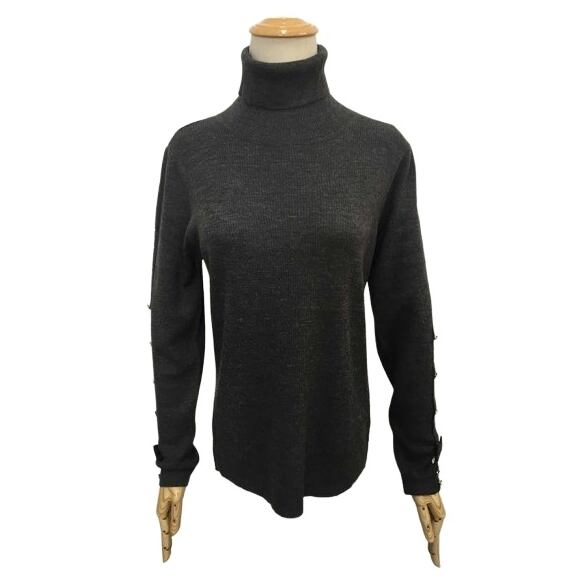 スーパービューティー ニット 袖リボン 金ボタンデザイン ハイネックセーター 2321023 グレー 2023年秋冬 大人かわいい服 大人スタイル レディース キレイメ アパレル 女性 M L LL Super Beauty 30代 40代 50代 60代