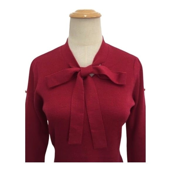 スーパービューティー ニット リボンタイ 袖リボン 金ボタン 2321024 レッド 2023年秋冬 大人かわいい服 大人スタイル レディース キレイメ アパレル 女性 M L LL Super Beauty 30代 40代 50代 60代