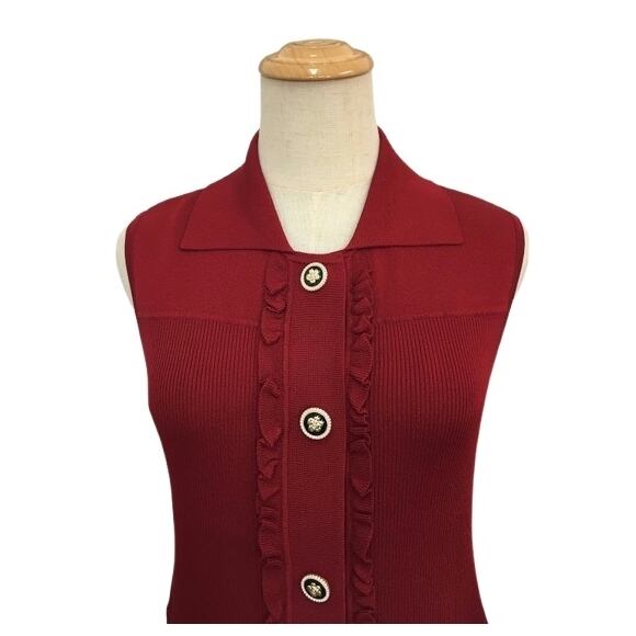 スーパービューティー ロングベスト 襟付き前立てフリル ロングジレ 2321002 レッド 2023年秋冬 大人かわいい服 オーラボー 大人スタイル キレイメ Super Beauty レディース アパレル 女性 M L LL 30代 40代 50代 60代