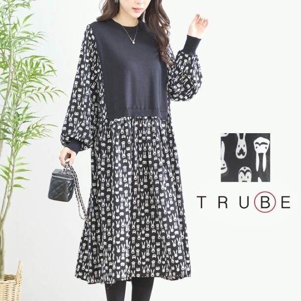 ワンピース レイヤード風 異素材 ドッキング ラビット柄 N83-059 reve bleu M~L 大人可愛い ミセス fmsd キレイメ 普段着 おしゃれ着 デイリーファッション レディース アパレル 女性 30代 40代 50代 60代 洋服 婦人服 可愛い服 大人スタイル
