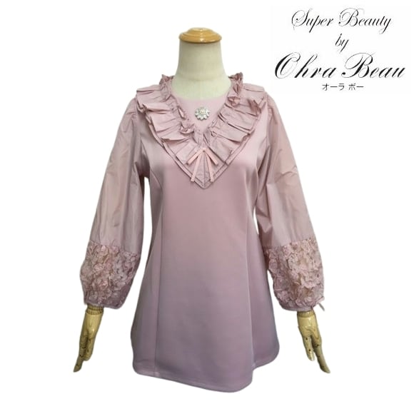 スーパービューティー チュニックカットソー 襟元フリル バルーン袖 2512004 ブラック 2025年春夏 オーラボー 大人かわいい服 大人スタイル キレイメ Super Beauty レディース アパレル 女性 M L LL 30代 40代 50代 60代